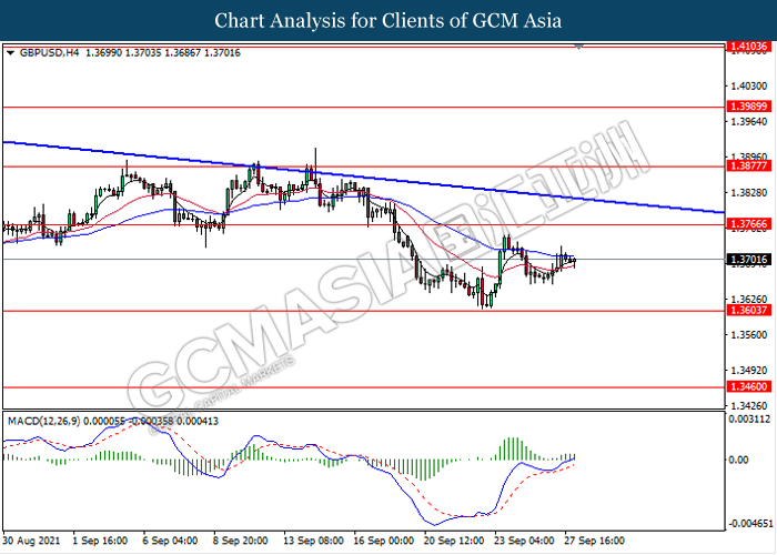 GBPUSD, H4: GBPUSD telah didagang dengan lebih tinggi susulan dengan lantunan dari paras rendahnya. MACD yang memaparkan isyarat bias bullish mencadangkan pasangan ini untuk melanjutkan keuntungannya ke arah tahap rintangan 1.3765.