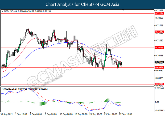 NZDUSD, H4: NZDUSD telah didagang dengan lebih tinggi susulan dengan lantunan dari tahap sokongan 0.6990. MACD yang memaparkan isyarat momentum bearish yang berkurangan mencadangkan pasangan ini untuk melanjutkan lantunannya ke arah tahap rintangan 0.7075.