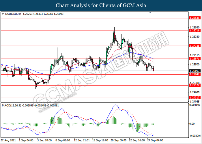 USDCAD, H4: USDCAD telah didagang dengan lebih rendah sementara ia sedang menguji berhampiran dengan tahap sokongan 1.2585. MACD yang memaparkan isyarat momentum bearish yang berterusan mencadangkan pasangan ini untuk melanjutkan kerugiannya selepas ia memecah tahap sokongan tersebut.