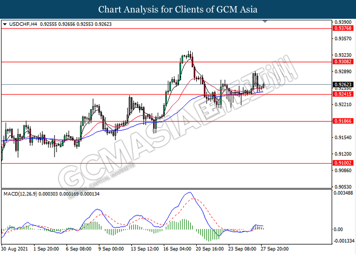 USDCHF, H4: USDCHF telah didagang dengan lebih tinggi susulan dengan lantunan dari tahap sokongan 0.924. MACD yang memaparkan isyarat momentum bullish mencadangkan pasangan ini untuk melanjutkan lantunannya ke arah tahap rintangan 0.9310.