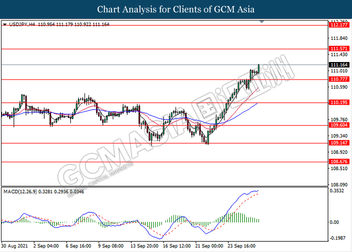 USDJPY, H4: USDJPY telah didagang dengan lebih tinggi susulan dengan pemecahan pada tahap rintangan sebelumnya 110.75. MACD yang memaparkan isyarat momentum bullish mencadangkan pasangan ini untuk melanjutkan keuntungannya ke arah tahap rintangan 111.55.