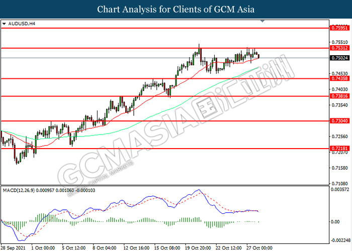 AUDUSD, H4: AUDUSD telah didagang dengan lebih tinggi sementara kini menguji di tahap rintangan 0.7530. MACD yang memaparkan momentum bullish mencadangkan pasangan ini untuk melanjutkan keuntungannya selepas ia memecah tahap rintangan tersebut.