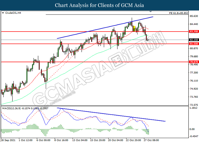 CrudeOIL, H4: Harga minyak mentah telah didagang dengan lebih rendah sementara kini menguji di tahap sokongan 81.50. MACD yang memaparkan momentum bearish mencadangkan pasangan ini untuk melanjutkan kerugiannya selepas ia memecah tahap sokongan tersebut.