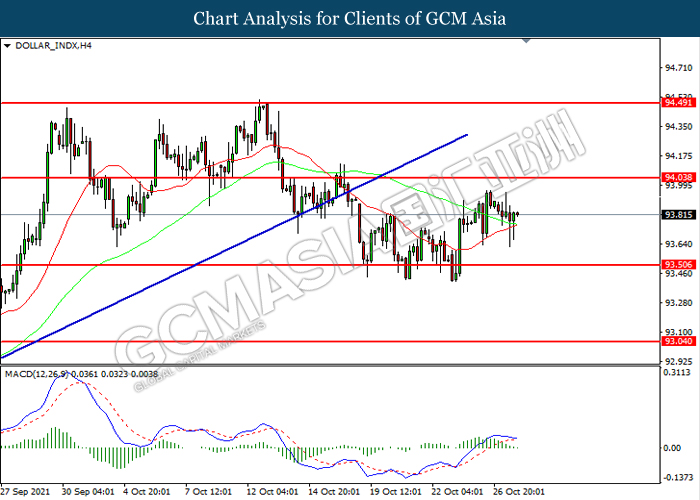 DOLLAR_INDX, H4: Indeks dolar telah didagang dengan lebih tinggi selepas ia melantun dari tahap sokongan 93.50. Namun, MACD yang memaparkan momentum bullish yang berkurangan mencadangkan indeks tersebut untuk mengalami pembetulan teknikal bagi jangka pendek.