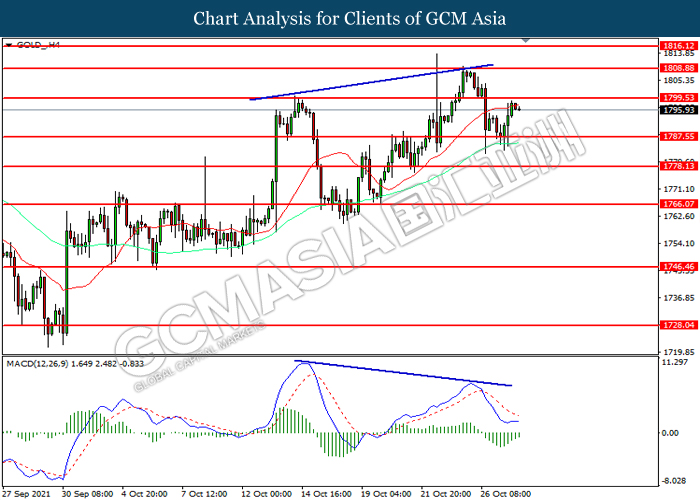 GOLD_, H4: Harga emas telah didagang dengan lebih tinggi sementara kini menguji di tahap rintangan 1799.55. MACD yang memaparkan momentum bearish yang berkurangan mencadangkan komoditi ini untuk melanjutkan keuntungannya selepas ia memecah tahap rintangan tersebut.