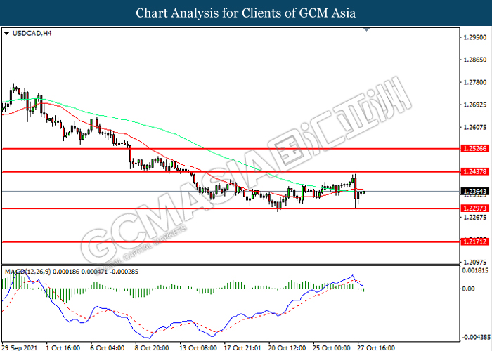USDCAD, H4: USDCAD telah didagang dengan lebih tinggi selepas ia melantun dari tahap sokongan 1.2295. Namun, MACD yang memaparkan momentum bearish mencadangkan pasangan ini untuk mengalami pembetulan teknikal bagi jangka pendek.