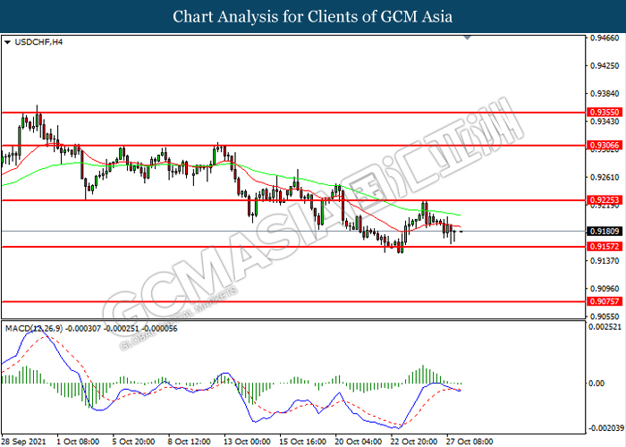 USDCHF, H4: USDCHF telah didagang dengan lebih rendah sementara kini menguji di tahap sokongan 0.9155. MACD yang memaparkan momentum bearish mencadangkan pasangan ini untuk melanjutkan kerugiannya selepas ia memecah tahap sokongan tersebut.