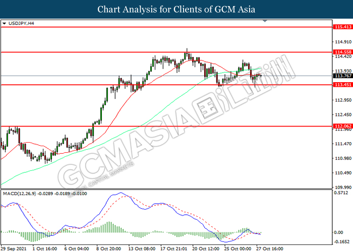 USDJPY, H4: USDJPY telah didagang dengan lebih rendah sementara kini menguji di tahap sokongan 113.45. MACD yang memaparkan momentum bearish mencadangkan pasangan ini untuk melanjutkan kerugiannya selepas ia memecah tahap sokongan tersebut.