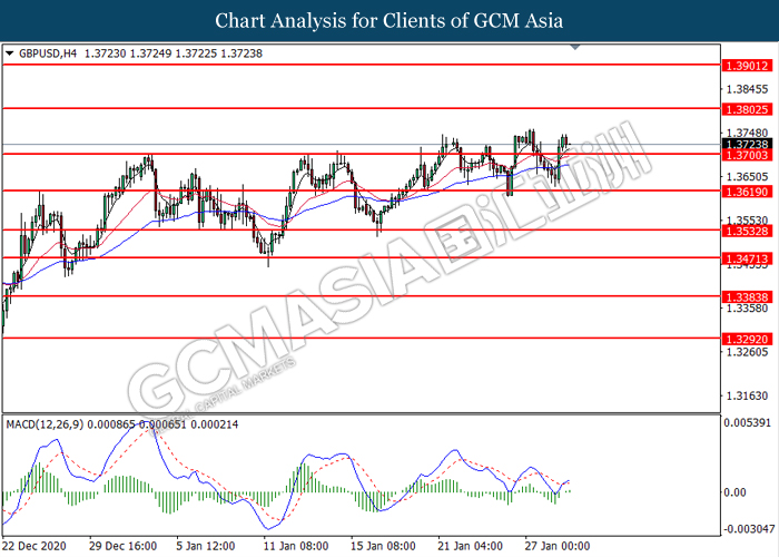 GBPUSD, H4: GBPUSD telah didagang dengan lebih tinggi selepas ia memecah tahap rintangan sebelumnya di 1.3700. MACD yang memaparkan momentum bullish yang berterusan mencadangkan pasangan ini untuk didagang dengan lebih tinggi dan menuju ke arah tahap rintangan di 1.3805.
