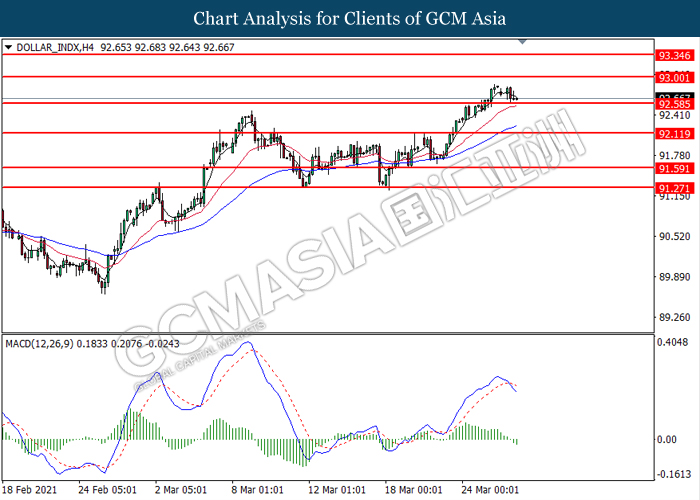 DOLLAR_INDX, H4: Indeks dolar telah didagang dengan lebih rendah sementara ia sedang menguji tahap sokongan di 92.60. MACD yang memaparkan isyarat momentum bearish yang berterusan mencadangkan indeks ini untuk melanjutkan kerugiannya selepas ia memecah tahap sokongan tersebut.