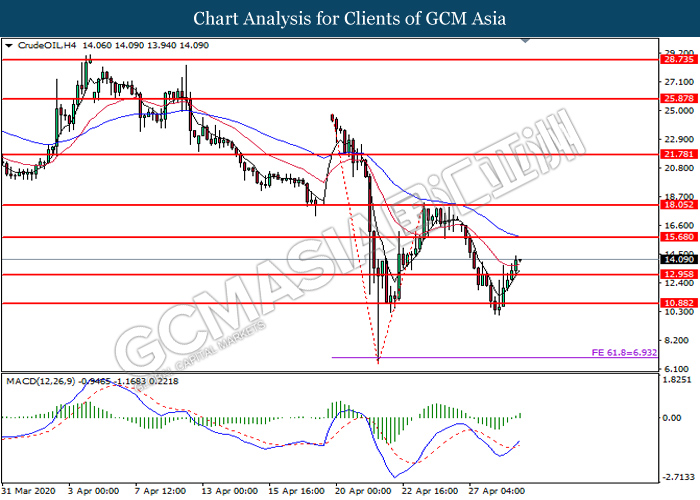 Dalam pasaran komoditi, harga minyak mentah telah mencatat keuntungannya sebanyak 1.02% ke $13.83 se tong semasa penulisan. Menurut kepada Reuters, pasaran minyak mentah telah didagang dengan lebih tinggi pada hari ini susulan dengan prospek optimisme untuk permintaan minyak mentah selepas negara-negara seperti Eropah dan juga beberapa bandar A.S. telah memutuskan untuk melonggarkan dasar “lock-down”. Selain itu, walaupun simpanan minyak telah cepat terisi, Penganalisis Rystad Energy menegaskan bahawa pemotongan bekalan minyak mentah sebanyak 300,000 tong sehari untuk Mei dan Jun dari OPEC akan dapat melambatkan pengisian simpanan minyak. Sebaliknya, pasaran emas telah mencatat kerugiannya sebanyak 0.13% ke $1703.69 se troy auns susulan dengan penyusutan dalam Dolar AS.
