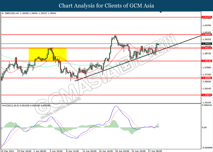 GBPUSD, H4: GBPUSD telah didagang dengan lebih tinggi selepas ia memecah tahap rintangan terdahulu 1.3910. MACD yang memaparkan momentum bullish mencadangkan pasangan ini untuk melanjutkan keuntungannya ke arah tahap rintangan 1.4010.
