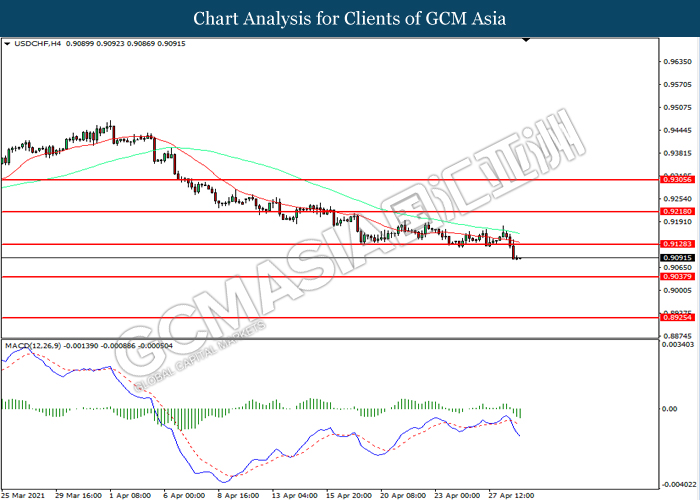 USDCHF, H4: USDCHF telah didagang dengan lebih rendah selepas ia memecah tahap sokongan terdahulu 0.9130. MACD yang memaparkan momentum bearish mencadangkan pasangan ini untuk melanjutkan kerugiannya ke arah tahap sokongan 0.9040.