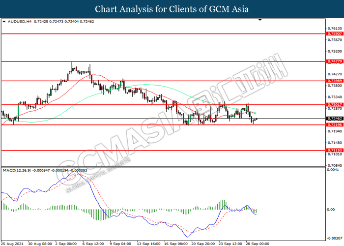 AUDUSD, H4: AUDUSD telah didagang dengan lebih rendah sementara kini menguji di tahap sokongan 0.7220. MACD yang memaparkan momentum bearish mencadangkan pasangan ini untuk mengalami pembetulan teknikal bagi jangka pendek.