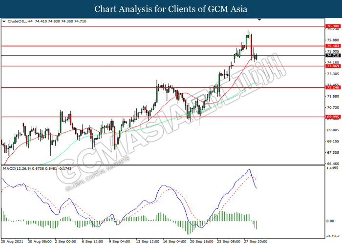 CrudeOIL, H4: Harga minyak mentah telah didagang dengan lebih rendah selepas ia memecah tahap sokongan terdahulu 75.40. MACD yang memaparkan momentum bearish mencadangkan komoditi ini untuk melanjutkan kerugiannya ke arah tahap sokongan 73.85.