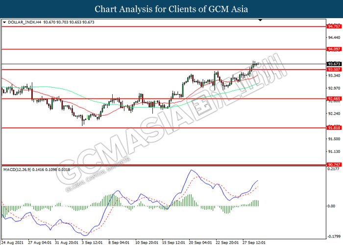DOLLAR_INDX, H4: Indeks dolar telah didagang dengan lebih tinggi selepas ia memecah tahap rintangan terdahulu 93.50. Namun, MACD yang memaparkan momentum bullish yang berkurangan mencadangkan indeks tersebut untuk mengalami pembetulan teknikal bagi jangka pendek.