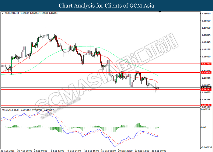 EURUSD, H4: EURUSD telah didagang dengan lebih rendah sementara kini menguji di tahap sokongan 1.1675. Namun, MACD yang memaparkan momentum bearish yang berkurangan mencadangkan pasangan ini untuk mengalami pembetulan teknikal bagi jangka pendek.