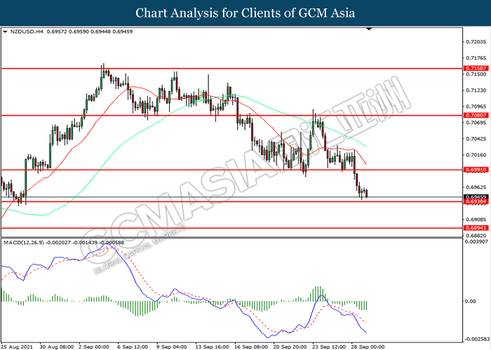 NZDUSD, H4: NZDUSD telah didagang dengan lebih rendah sementara kini menguji di tahap sokongan 0.6940. MACD yang memaparkan momentum bearish mencadangkan pasangan ini untuk melanjutkan kerugiannya selepas ia memecah tahap sokongan tersebut.