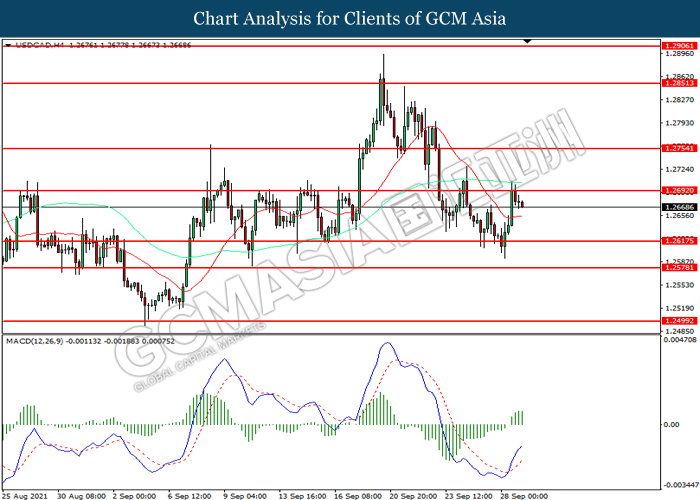 USDCAD, H4: USDCAD telah didagang dengan lebih tinggi sementara kini menguji di tahap rintangan 1.2690. MACD yang memaparkan momentum bullish mencadangkan pasangan ini untuk melanjutkan keuntungannya selepas ia memecah tahap rintangan tersebut.