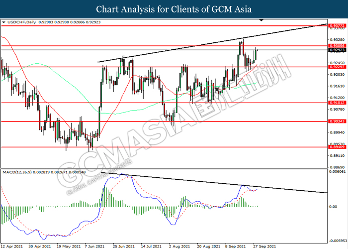USDCHF, Daily: USDCHF telah didagang dengan lebih tinggi sementara kini menguji di tahap rintangan 0.9305. MACD yang memaparkan momentum bullish mencadangkan pasangan ini untuk melanjutkan keuntungannya selepas ia memecah tahap rintangan tersebut.