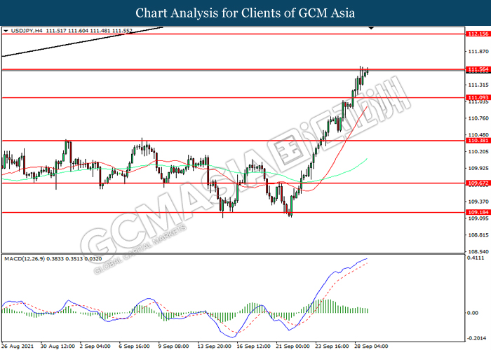 USDJPY, H4: USDJPY telah didagang dengan lebih tinggi sementara kini menguji di tahap rintangan 111.55. Namun, MACD yang memaparkan momentum bullish yang berkurangan mencadangkan pasangan ini untuk mengalami pembetulan teknikal bagi jangka pendek.