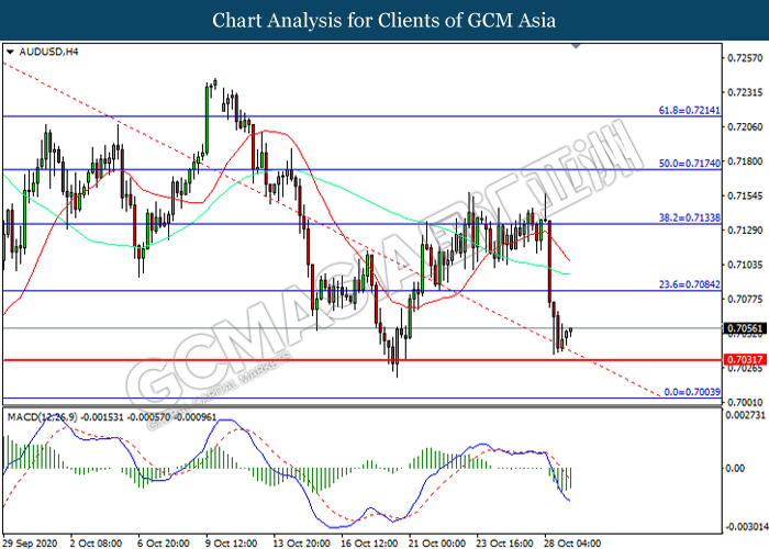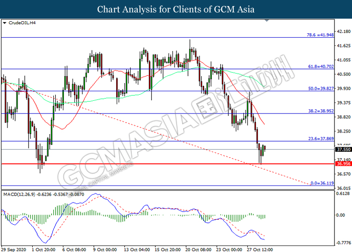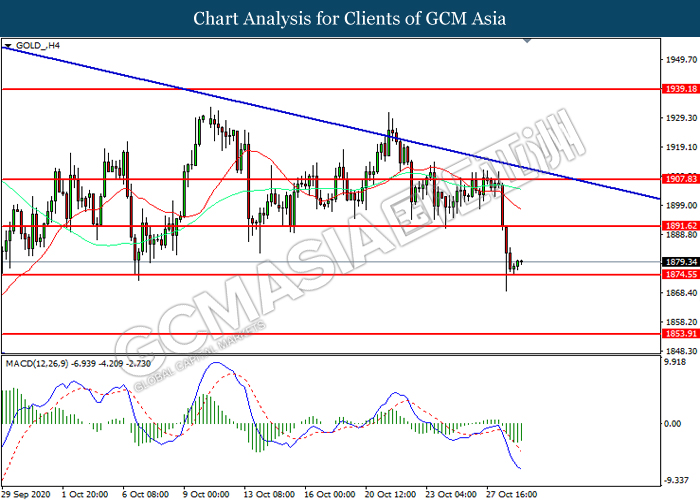 Bagi pasaran komoditi, harga minyak mentah telah mencatat kerugiannya sebanyak 0.10% ke $37.60 se tong semasa penulisan. Pasaran minyak mentah telah menyusut dengan ketara semalam susulan dengan para pelabur khuatir bahawa dasar-dasar “lock-down” terbaru dari Eropah dan juga peningkatan kes-kes koronavirus yang mendadak akan terus mencetuskan prospek negatif ke atas permintaan minyak mentah. Sebaliknya, harga emas telah menurun sebanyak 0.05% ke $1878.70 se troy auns semasa penulisan susulan dengan para pelabur mula menjual komoditi emas sambil menukarnya menjadi wang tunai untuk mengelakkan panggilan margin daripada bank berikutan kemalangan pasaran ekuiti global semalam.