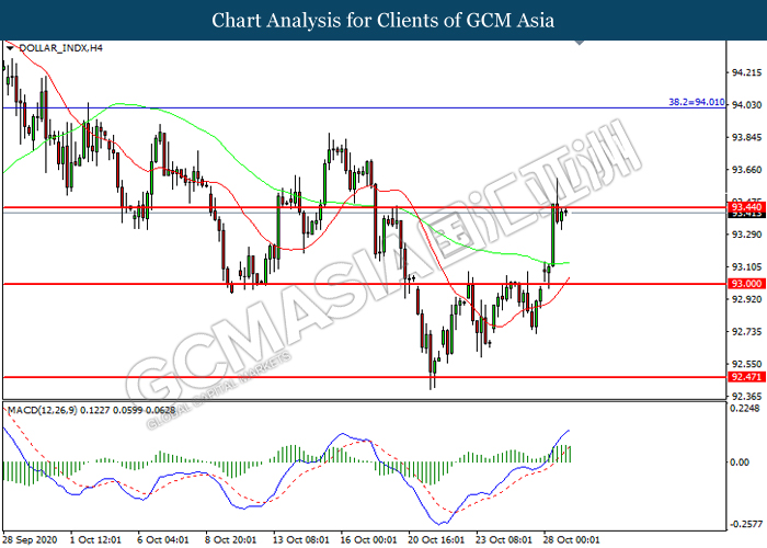 DOLLAR_INDX, H4: Indeks dolar telah didagang dengan lebih tinggi sementara kini menguji di tahap rintangan 93.45. Namun, MACD yang memaparkan momentum bullish yang berkurangan mencadangkan indeks tersebut untuk mengalami pembetulan teknikal bagi jangka pendek.
