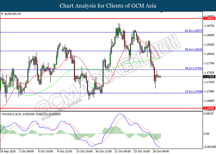 Pasangan EUR/USD telah melanjutkan kerugiannya dengan ketara ke paras terendah satu minggu di tengah-tengah berita mengenai dasar “lock-down” di Jerman dan Perancis untuk mengekang kenaikan mendadak jangkitan Covid-19, yang selanjutnya mengurangkan keyakinan pasaran ke atas perkembangan ekonomi di Eropah sambil mencetuskan momentum bearish yang ketara ke atas mata wang Euro. Menurut kepada Reuters, Jerman telah memutuskan untuk menutup bar dan restoran selama sebulan dan Perancis bersedia untuk mengetatkan kawalan pergerakan. Di bawah langkah-langkah baru Perancis yang berkuat kuasa pada hari Jumaat, penduduk Perancis akan diminta untuk tinggal di rumah kecuali untuk membeli barang keperluan, mendapatkan bantuan perubatan atau bersukan selama satu jam sehari. Selain itu, pekerja Perancis akan dibenarkan bekerja sekiranya majikan mereka menganggap mustahil bagi mereka untuk melakukan pekerjaan dari rumah sementara sekolah akan tetap terbuka. Serangkaian langkah baru untuk memerangi wabak koronavirus dari rantau Eropah telah mendorong aset berisiko di seluruh dunia menyusut dengan ketara di tengah-tengah para pelabur menjangkakan bahawa langkah-langkah tersebut akan terus mendorong ekonomi global tahun ini ke dalam kemelesetan terdalam generasi. Semasa penulisan, EUR/USD telah menyusut sebanyak 0.02% ke $1.1745.