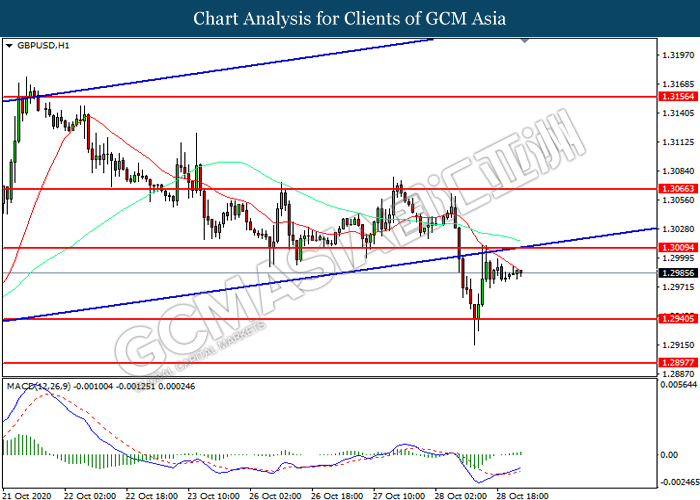 GBPUSD, H1: GBPUSD telah didagang dengan lebih tinggi selepas ia melantun dari tahap sokongan 1.2940. MACD yang memaparkan momentum bullish mencadangkan pasangan ini untuk melanjutkan keuntungannya ke arah tahap rintangan 1.3010.
