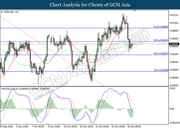 NZDUSD, H4: NZDUSD telah didagang dengan lebih rendah selepas ia memecah tahap sokongan terdahulu 0.6655. Namun, MACD yang memaparkan momentum bearish yang berkurangan mencadangkan pasangan ini untuk mengalami pembetulan teknikal bagi jangka pendek.