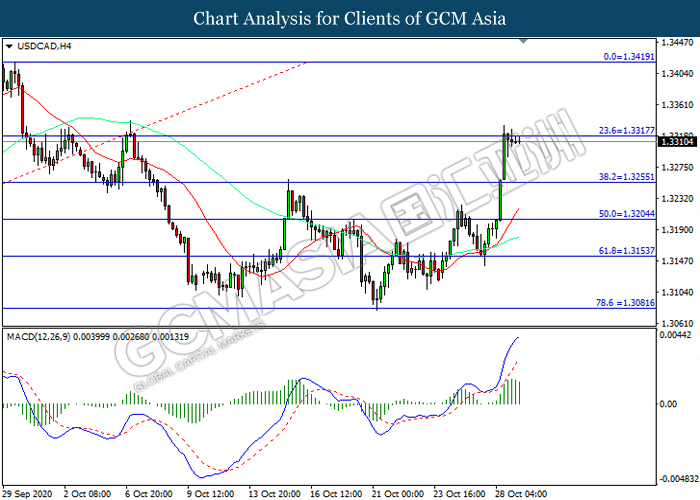 USDCAD, H4: USDCAD telah didagang dengan lebih tinggi sementara kini menguji di tahap rintangan 1.3315. Namun, MACD yang memaparkan momentum bullish yang berkurangan mencadangkan pasangan ini untuk mengalami pembetulan teknikal bagi jangka pendek.