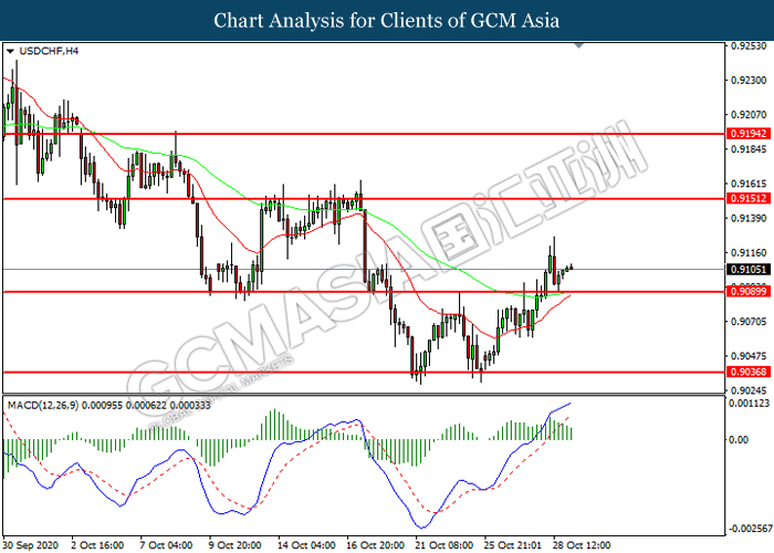 USDCHF, H4: USDCHF telah didagang dengan lebih tinggi selepas ia melantun dari tahap sokongan 0.9090. Namun, MACD yang memaparkan momentum bullish yang berkurangan mencadangkan pasangan ini untuk mengalami pembetulan teknikal bagi jangka pendek.