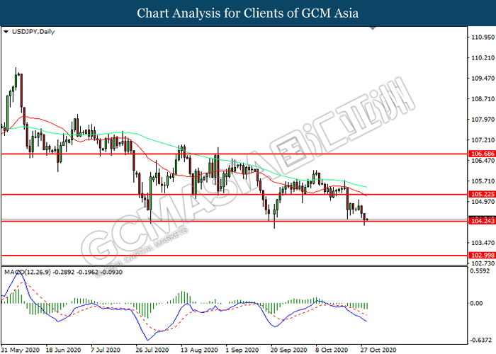 USDJPY, Daily: USDJPY telah didagang dengan lebih rendah sementara kini menguji di tahap sokongan 104.25. MACD yang memaparkan momentum bearish mencadangkan pasangan ini untuk melanjutkan kerugiannya selepas ia memecah tahap sokongan tersebut.