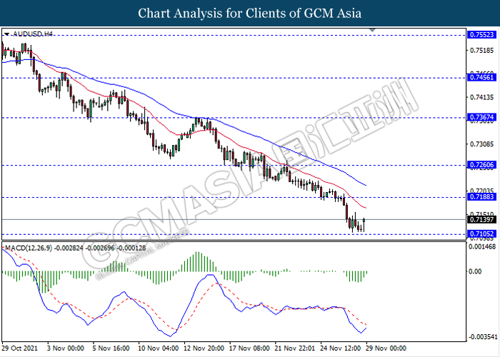 AUDUSD, H4: AUDUSD telah didagang dengan lebih tinggi susulan dengan lantunan dari tahap sokongan 0.7105. MACD yang memaparkan isyarat momentum bearish yang berkurangan mencadangkan pasangan ini untuk melanjutkan lantunannya ke arah tahap rintangan 0.7190.