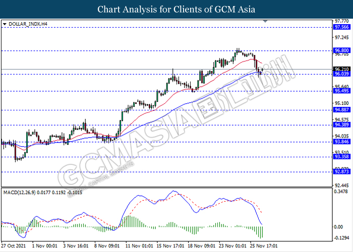 DOLLAR_INDX, H4: Indeks dolar telah didagang dengan lebih tinggi susulan dengan lantunan dari tahap sokongan 96.05. MACD yang memaparkan isyarat momentum bearish yang berkurangan mencadangkan dolar untuk melanjutkan lantunnya ke arah tahap rintangan 96.80.