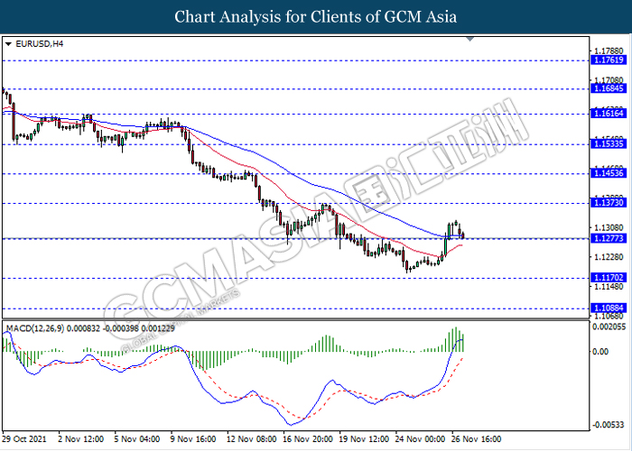 EURUSD, H4: EURUSD telah didagang dengan lebih rendah sementara ia sedang menguji tahap sokongan 1.1275. MACD yang memaparkan isyarat momentum bullish yang berkurangan mencadangkan pasangan ini untuk melanjutkan pengundurannya selepas ia memecah tahap sokongan tersebut.