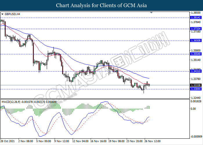 Mata wang paun sterling yang didagang terhadap dolar dan pasangan mata wang lain kekal tertekan dan jatuh di tengah-tengah penyebaran virus baharu Omicron di UK. Menurut Agensi Keselamatan Kesihatan UK, kes ketiga varian koronavirus Omicron telah dikesan di UK. Selepas kes Omicron tersebut, Perdana Menteri Britain, Boris Johnson mengumumkan penggunaan topeng yang wajib di tempat awam untuk mengekang penyebarannya. Para saintis menyatakan bahawa penyebaran koronavirus yang baru tersebut adalah 5 kali ganda daripada virus Delta dan ia juga boleh mengelakkan sistem imunisasi. Para pelabur bimbang varian Omicron akan tersebar secara meluas di UK dan mendorong kerajaan pusat Britain melaksanakan perintah kawalan pergerakan yang komprehensif, justerunya berpotensi menjejaskan pemulihan ekonomi dan menyebabkan kemelesetan ekonomi pada masa hadapan. Semasa penulisan, GBP/USD telah jatuh sebanyak 0.03% kepada 1.3336.