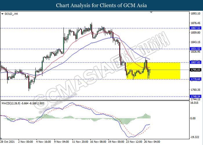 Dalam pasaran komoditi, harga minyak mentah telah melantun sebanyak 5.15% kepada $72.39 tong pada masa penulisan susulan pembetulan teknikal. Walau bagaimanapun, sentimen secara keseluruhan kekal lemah kerana penyebaran Omicron baru yang bermutasi boleh menjejaskan ekonomi global dan juga permintaan minyak mentah. Sebaliknya, harga emas meningkat sebanyak 0.44% kepada $1795.93 se troy auns pada masa penulisan di tengah-tengah peningkatan permintaan untuk aset selamat akibat virus Omicron.