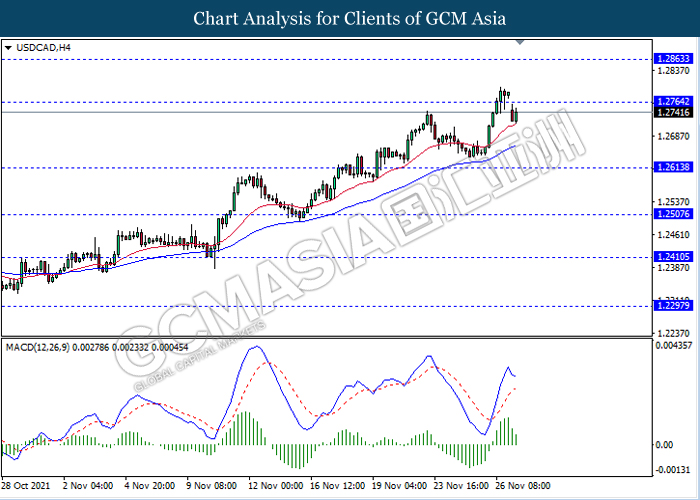 USDCAD, H4: USDCAD telah didagang dengan lebih rendah susulan dengan pengunduran dari tahap rintangan 1.2765. MACD yang memaparkan isyarat momentum bullish mencadangkan pasangan ini untuk melanjutkan pengundurannya ke arah tahap sokongan 1.2615.