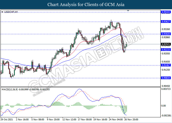 USDCHF, H4: USDCHF telah didagang dengan lebih tinggi susulan dengan lantunan dari tahap sokongan 0.9225. MACD yang memaparkan isyarat momentum bearish yang berkurangan mencadangkan pasangan ini untuk melanjutkan lantunannya ke arah tahap rintangan 0.9300.