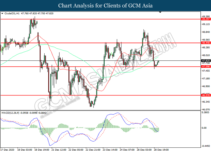 Bagi pasaran komoditi, pasaran minyak mentah telah mencatat keuntungannya sebanyak 0.25% ke $47.80 se tong semasa penulisan susulan dengan prospek positif mengenai vaksin Covid-19 dan juga rangsangan ekonomi dari A.S. telah memberikan momentum bullish ke atas komoditi tersebut. Sebaliknya, pasaran emas telah menyusut sebanyak 0.25% ke $1875.55 se troy auns semasa penulisan susulan dengan peningkatan sentimen selera risiko dalam pasaran FX telah mengurangkan daya tarikan ke atas aset selamat.