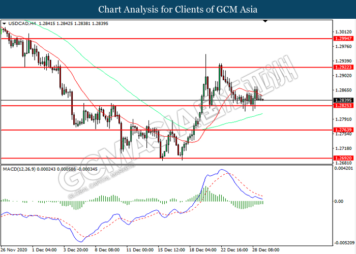 USDCAD, H4: USDCAD telah didagang dalam saluran sisi sementara kini menguji di tahap sokongan 1.2825. MACD yang memaparkan momentum bearish yang berkurangan mencadangkan pasangan ini untuk mengalami pembetulan teknikal bagi jangka pendek.