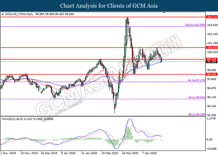 Indeks dolar yang mengukur nilainya terhadap sekumpulan enam mata wang utama merosot berikutan AS membebaskan serangkaian data ekonomi suram dari negaranya. Menurut Bureau of Economic Analysis, kadar GDP negaranya untuk suku pertama pada tahun 2020 dibebaskan pada -4.8%, lebih rendah daripada anggaran ekonomis iaitu pada -4.0%, membuktikan bahawa AS telah mengalami kemerosotan ekonomi pada tahap awal pandemik. Namun, data tersebut belum sepenuhnya mencerminkan kejatuhan coronavirus terhadap ekonomi AS, dan data ekonomi yang akan datang mungkin lebih buruk lagi. Selain itu, data US Pending Home Sales turun 20.8%, lebih lemah daripada ramalan ekonomis iaitu pada -10.0%, menunjukkan bahawa sektor perumahan berubah ‘masam’ akibat kesan negatif virus. Sejak tercetusnya Covid-19, ekonomi global telah ditekan dengan ketara sementara AS adalah negara yang paling terjejas. Menurut statistik terkini, kes yang dijangkiti di AS adalah sejumlah 1,035,675 kes, mencatat kes tertinggi dan kadar pertumbuhan tertinggi di antara semua negara. Meskipun demikian, kerugian dolar AS dibatasi kerana pergerakan baru-baru ini untuk membuka semula ekonomi telah meningkat daya tarikan dolar, di mana pasaran percaya bahawa ekonomi akan melantun dalam jangka masa yang pendek. Semasa sesi perdagangan awal Asia, indeks dolar jatuh 0.37% ke 99.50.