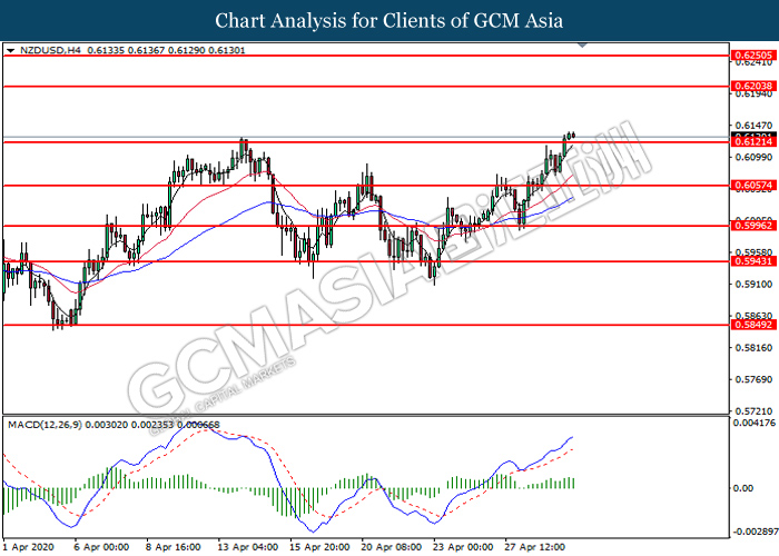 NZDUSD, H4: NZDUSD telah didagang dengan lebih tinggi selepas ia memecah tahap rintangan sebelumnya di 0.6120. MACD yang memaparkan isyarat momentum bullish yang berterusan mencadangkan pasangan ini untuk didagang dengan lebih tinggi dan menuju ke tahap rintangan seterusnya.