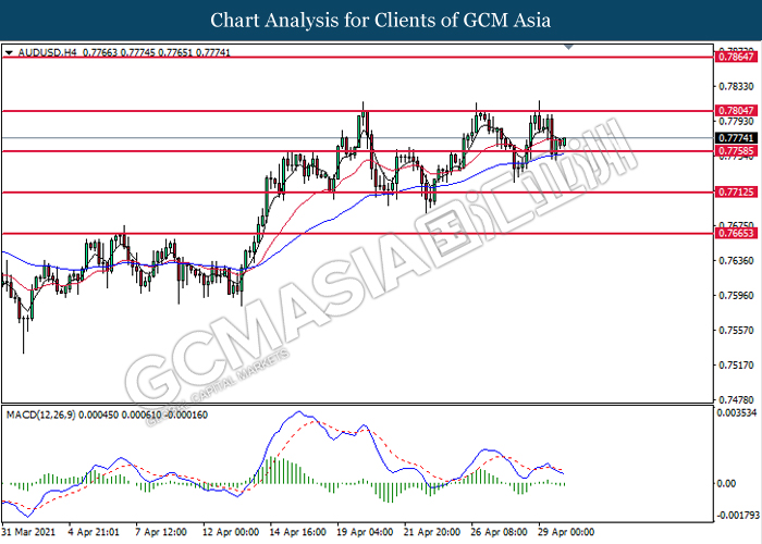 AUDUSD, H4: AUDUSD telah didagang dengan lebih tinggi selepas ia melantun dari tahap sokognan di 0.7760. However, MACD yang memaparkan momentum bearish yang berterusan mencadangkan pasangan ini untuk mengalami pembetulan teknikal dan menuju ke arah yang lebih rendah.