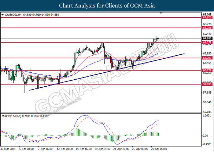 Di pasaran komoditi, harga minyak mentah meningkat 0.06% ke $64.85 setong kerana dolar AS yang murah dan jangkaan pemulihan yang kuat di pasaran minyak terus menimbang pada pasaran minyak, dan mengabaikan kebimbangan terhadap lonjakan kes India dan Brazil. Selain itu, harga emas menyusut 0.01% ke $1772.10 setroy auns di tengah kelemahan dolar AS.