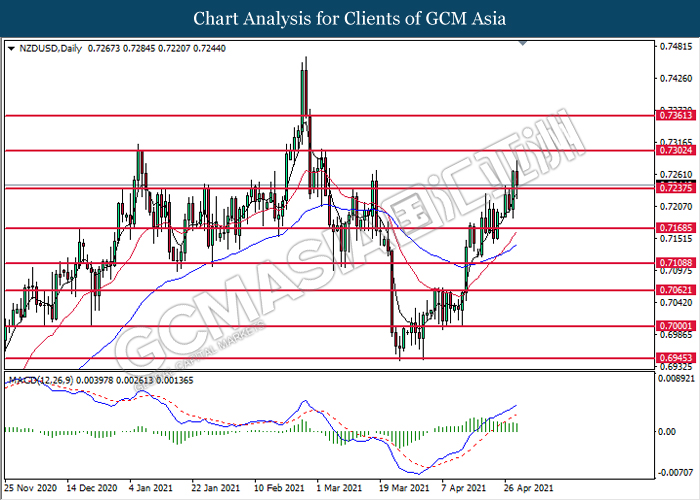 NZDUSD, Daily: NZDUSD telah didagang dengan lebih tinggi selepas ia memecah tahap rintangan sebelumnya di 0.7235. MACD yang menunjukkan isyarat momentum bullish yang berterusan mencadangkan pasangan ini untuk melanjutkan keuntungannya dan menuju ke arah tahap rintangan di 0.7300.