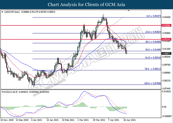 USDCHF, Daily: USDCHF telah didagang dengan lebih rendah selepas ia memecah tahap sokongan sebelumnya di 0.9110. MACD yang menunjukkan isyarat momentum bearish yang berterusan mencadangkan pasangan ini untuk melanjutkan kerugiannya dan menuju ke arah tahap sokongan di 0.9030.