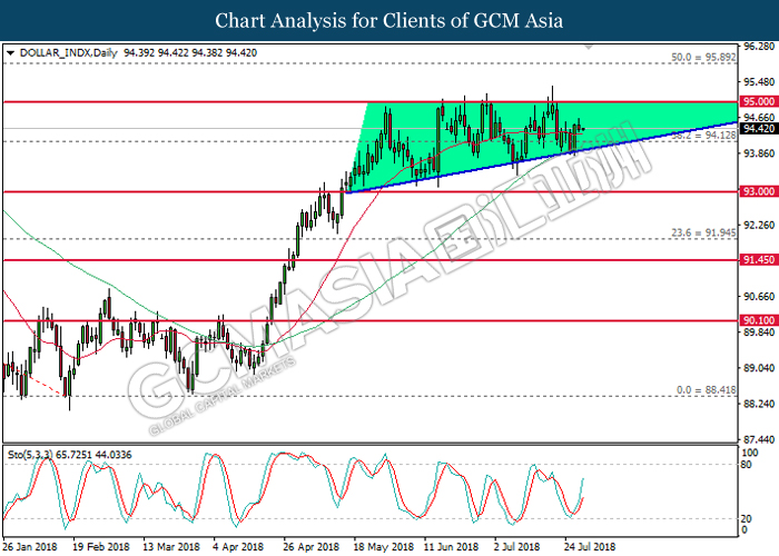DOLLAR_INDX, Daily: Indeks dolar kekal didagang di dalam segi tiga menaik selepas ia melantun dari paras bawahnya. Petunjuk Stochastic Oscillator yang memaparkan isyarat lantunan mencadangkan indeks ini untuk melanjutkan kenaikannya dan menuju ke arah paras atas segi tiga.