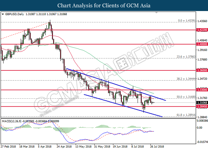 GBPUSD, Daily: GBPUSD kekal didagang di dalam saluran menurun selepas ia berundur dari paras atasnya. MACD histogram yang mula untuk membentuk isyarat bearish mencadangkan pasangan ini untuk didagang dengan lebih rendah pada jangka pendek dan menuju ke arah tahap sokongan 1.3045.